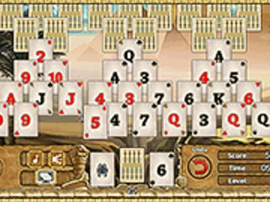 Joc de Solitaire Tripeaks distractiv, cu derulare, în Egiptul Antic. Elimină toate cărțile jucând cărți care au o valoare cu 1 mai mare sau cu 1 mai mică decât cartea deschisă (jos, în dreapta).