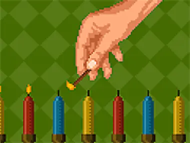 A retro game style. It was made as a greeting card for Hanukkah.