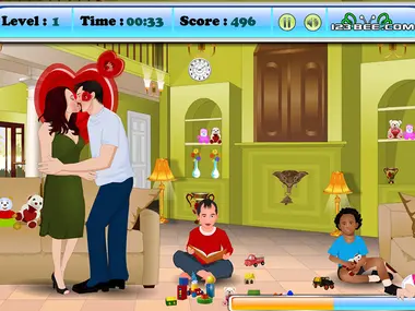 Level 1: Make Brad Pitt kiss Angelina Jolie until the kissing status bar gets completed. But, while kissing each other, it should be done in a way such that the kids Zoharra and Maddox shouldn't notice the kissing action. If the kids notice the kissing action, the game gets over. Get more score by completing this level, and proceed to further levels. Level 2: In this level, while the romantic pair tries to go on a kissing spree, two more kids along with Zoharra and Maddox, Shiloh and Pax, get included. Without inviting the notice of these four kids, the romantic pair will have to complete the kissing action to reach further levels. Level 3: At this level, Ceon and Vivienne appear along with the four kids. This romantic pair will have to successfully complete the kissing action, in such a way that the action does not attract the attention of all these six kids. By doing this, the romantic pair will have to prove their love for each other.