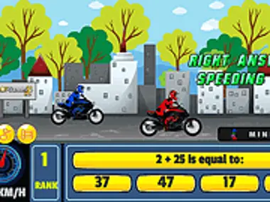 Bike Racing Math este un joc de matematică combinat cu curse moto. Ai o selecție largă de probleme de matematică de rezolvat, iar fiecare răspuns corect îți va accelera motocicleta pentru a prinde viteză mai mare. Câștigă cursa făcând clic pe răspunsul corect pentru a accelera motocicleta. Făcând clic pe un răspuns incorect îți va încetini motocicleta. În acest joc, va trebui să faci clic pe răspunsul corect al unei sume matematice. Bucură-te de joc aici pe Y8.com!
