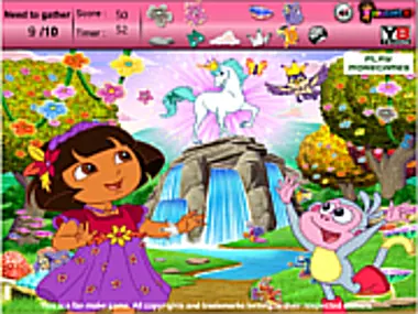 Look at the pictures Dora and her friends and find all the hidden objects with your mouse. Complete the list before time runs out.